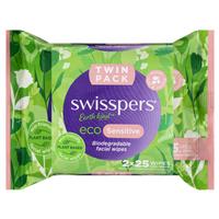 swisspers eco sensitive biodegradable facial wipes twin pack 2 x 25 wipes